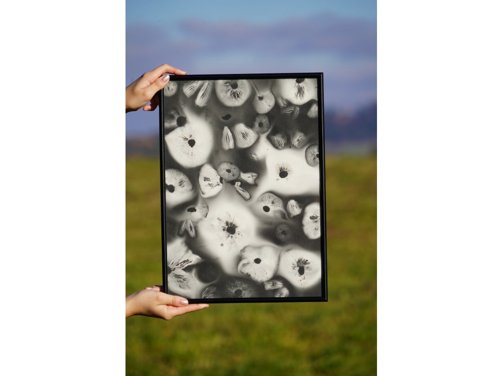 Tento jedinečný obraz vznikl z výtrusů václavek obecných, které jsme sami sbírali, sušili a pečlivě použili k vytvoření pravého spore-printu. Každý výtrus osázel papír natolik jemně, že vzniká přirozený, organický vzor připomínající lesní síť. Výsledek zabalíme pod sklo v elegantní rám, který chrání jemné otisky a zároveň dává dílu profesionální a čistý vzhled.